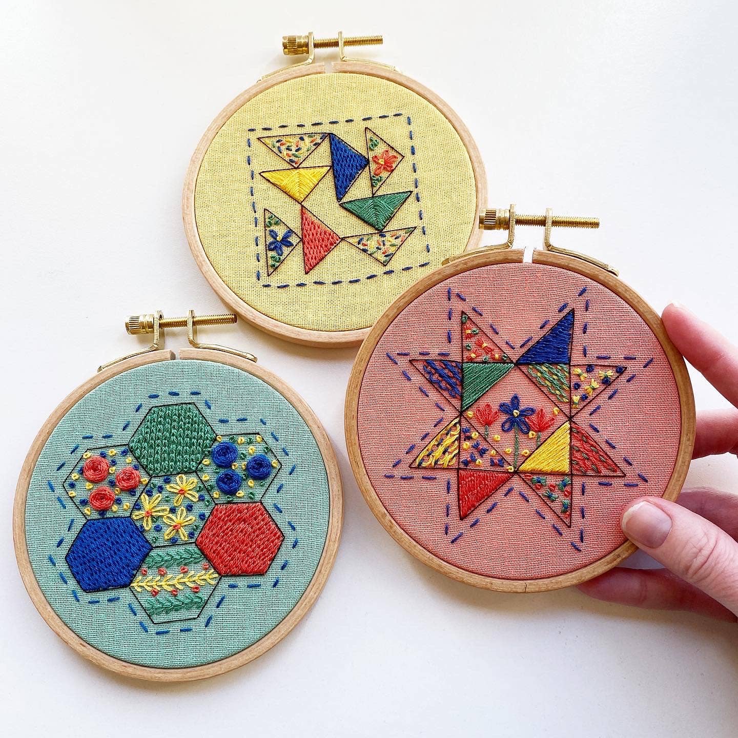 Just add scissors! This embroidery kit has everything you need to complete the shown Seeing Starflowers embroidery inspired by the traditional Starflower quilt block. Are you crafty? Can you follow instructions? Then you can do this! Every stitch in this project is well explained and suitable for a beginner embroiderer. This is a Modern Sampler so while I tell you exactly how I did mine, you get to choose which stitches to focus on, where you place them, and which colors you use! We are an eco conscious brand. While we are not perfect, we are proud that our kits have NO plastic packaging and our booklets and labels are printed on 100% recycled paper. Contents: - quality 4” beechwood embroidery hoop - linen blend fabric - 5 skeins of DMC embroidery floss - 2 needles - water soluble (blue) pen - pattern - easy to follow instruction booklet with color pictures - felt for backing All this comes in a project bag to keep everything together (that also means minimal packaging)!
